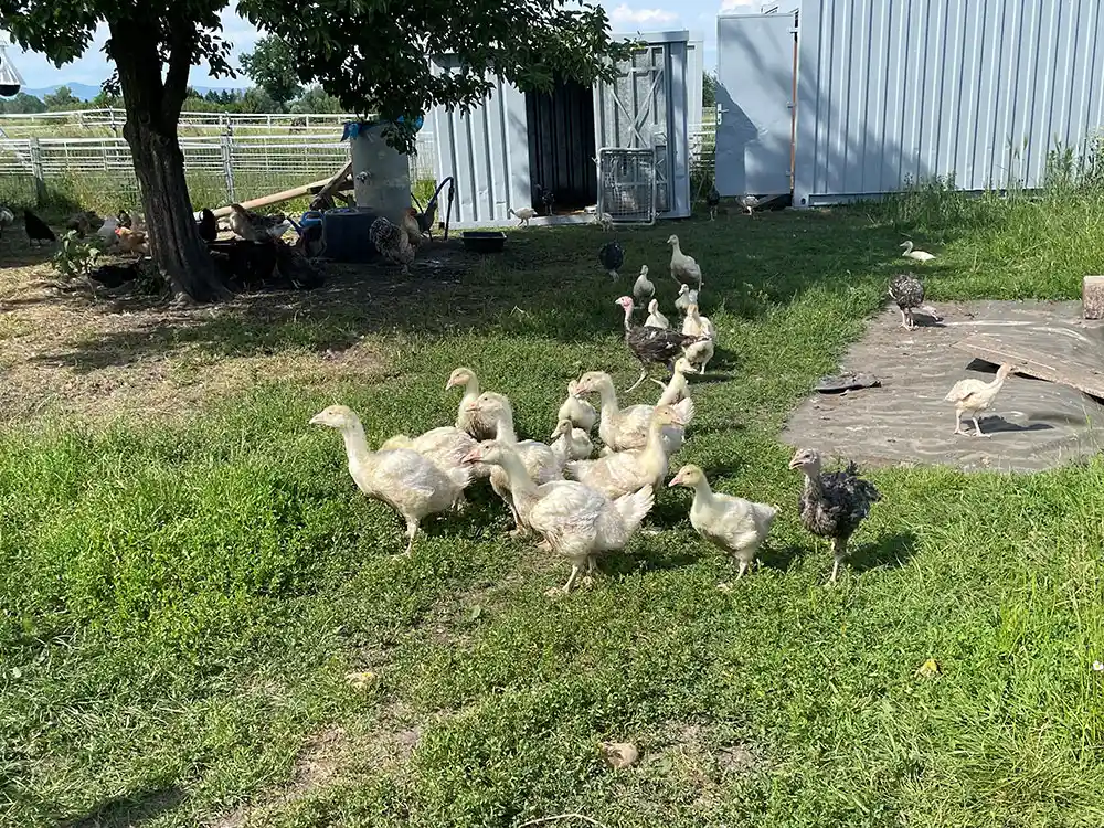 Da wir der Überzeugung sind, dass es nicht die richtige Richtung ist, nur auf große monotone Betriebe zu setzen, halten wir als Selbstversorgerhof, auch andere Tiere wie Enten, Gänse, Puten, Perlhühner.