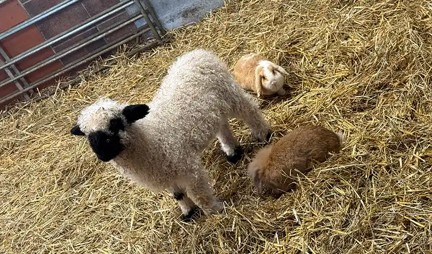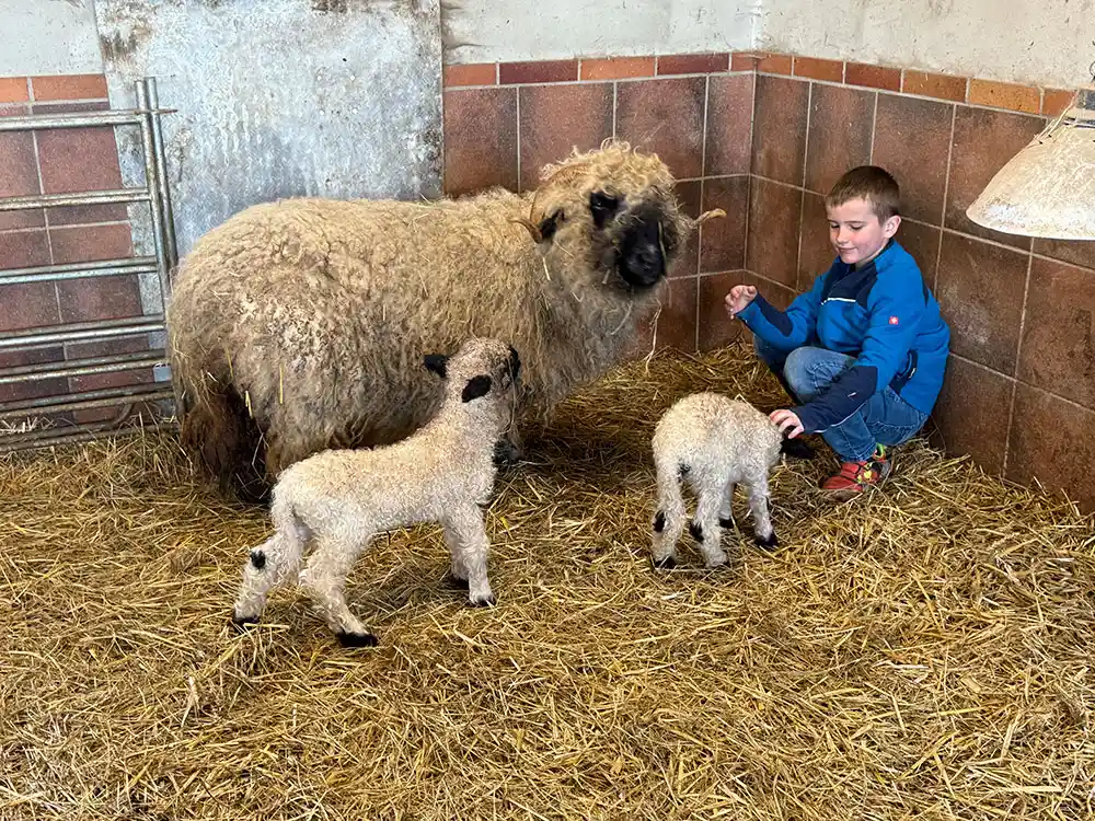 Ebenso haben wir noch eine kleine Herde Waliser Schwarznasenschafe. Diese Schweizer Bergschafrasse ist besonders anhänglich und somit sind sie die Lieblinge aller Kinder.